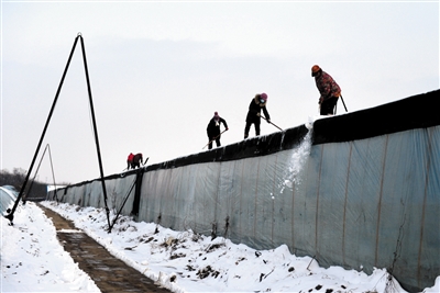 ▲12月11日,石家庄市栾城区岗头村种植户在清理大棚上的积雪。