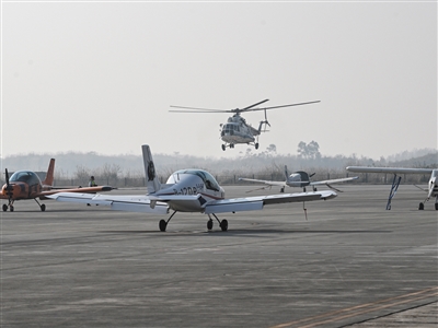 12月24日,在成都市金堂县淮州机场,一架直升机准备降落。