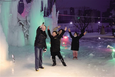 图为游客在冰景前拍照留念。 本报记者 韩堃 摄