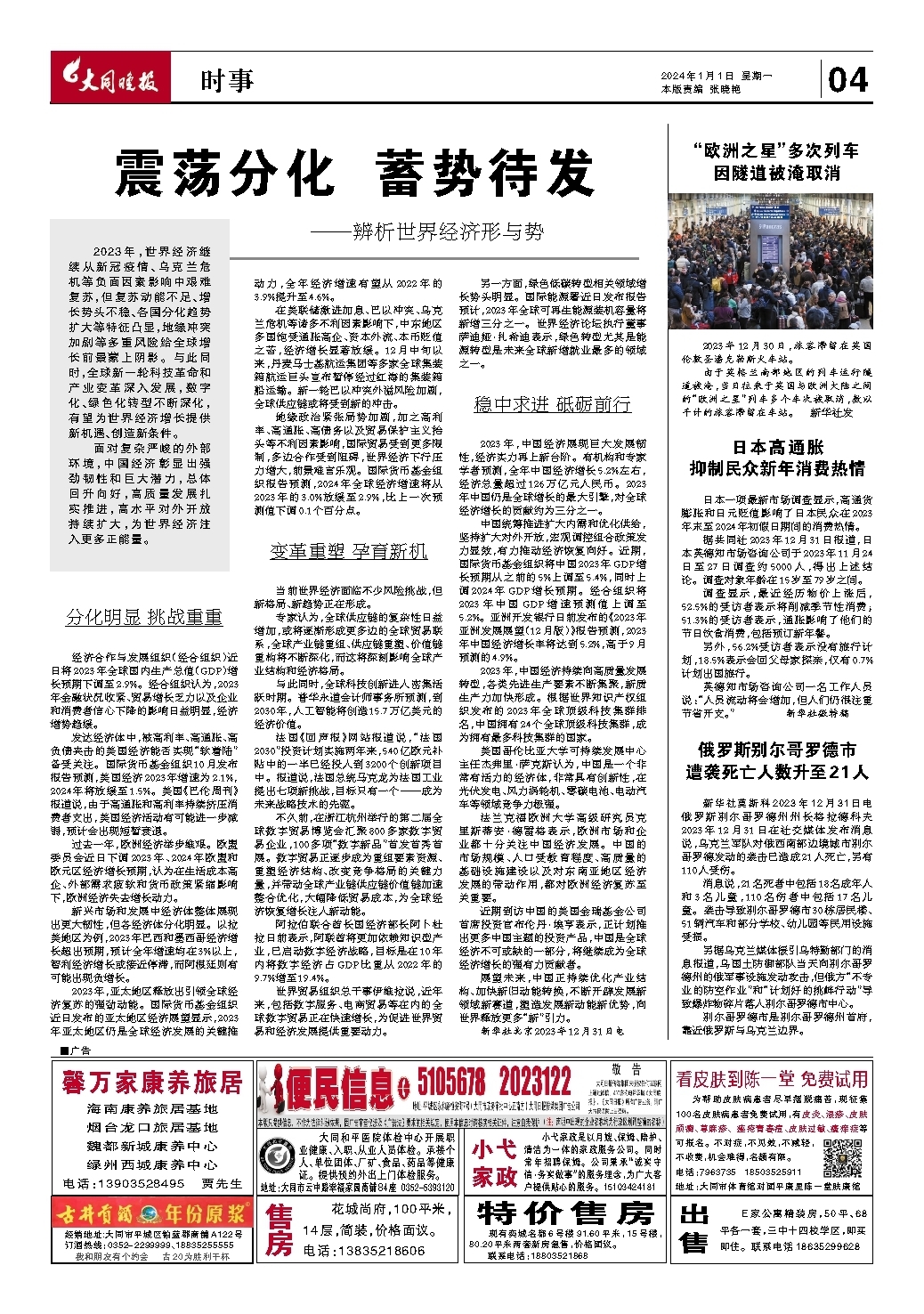 2023年,世界经济继续从新冠疫情、乌克兰危机等负面因素影响中艰难复苏,但复苏动能不足、增长势头不稳、各国分化趋势扩大等特征凸显,地缘冲突加剧等多重风险给全球增长前景蒙上阴影。与此同时,全球新一轮科技革命和产业变革深入发展,数字化、绿色化转型不断深化,有望为世界经济增长提供新机遇、创造新条件。