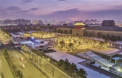 日前,城墙带状公园和阳门外广场的“山西大同2023-2024欢乐冰雪季”活动现场正在加紧建设中。