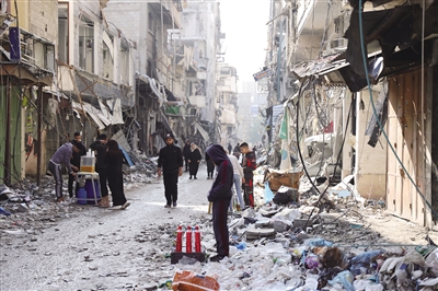 1月2日,人们从加沙城的建筑物废墟附近走过。