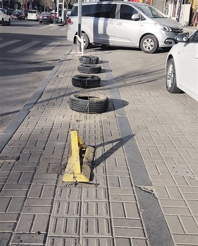 接到反映后,记者来到红旗街附近路段,看到在馨泰花园小区西门附近的盲道上,的确有人在上面设置了一个地锁,还有四五个废弃轮胎一字摆开成为路障。设置人担心被人挪走,不仅将地锁固定,还用钢筋进行加固,几个轮胎也用铁丝串连起来,与地面用钢筋固定。