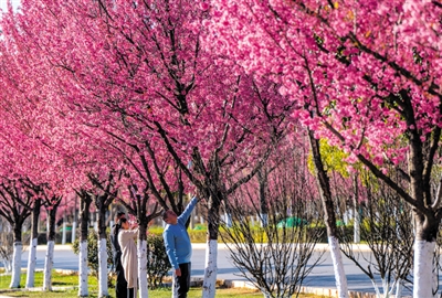 近日,云南省昆明市阳光明媚,气候宜人。市区的冬樱花绚烂绽放,吸引众多市民和游客驻足观赏,拍照留念。