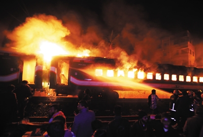 1月5日,在孟加拉国首都达卡,消防员在列车起火事故现场进行灭火。