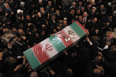 1月5日,在伊朗德黑兰,人们参加克尔曼市爆炸袭击事件遇难者的葬礼。