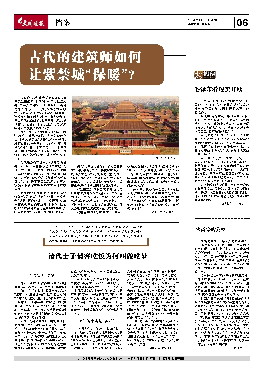 乾隆皇帝在《冬夜偶成》一诗中,曾较为详细地记述了紫禁城冬季的“供暖”情况及其感受,诗曰:“人苦冬日短,我爱冬夜长。皓月悬长空,朔风瓢碎霜。垂帘在氍毹,红烛明涂堂。博山炷水沉,和以梅蕊香。敲诗不觉冷,漏永夜未央”。
