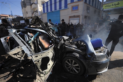 1月7日,在加沙地带南部城市拉法,人们查看被以军袭击后的受损车辆。