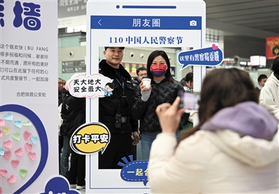 ▶1月8日,合肥铁路公安处民警在合肥南站候车室和旅客互动合影。