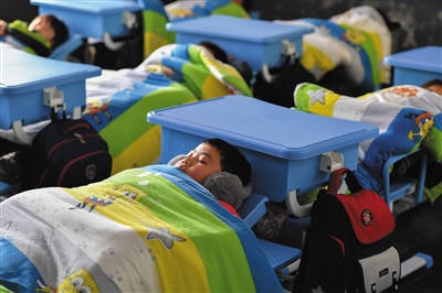 ▲1月10日,在浏阳市龙伏镇黄桥完全小学,三年级学生使用可躺式课桌椅午休。