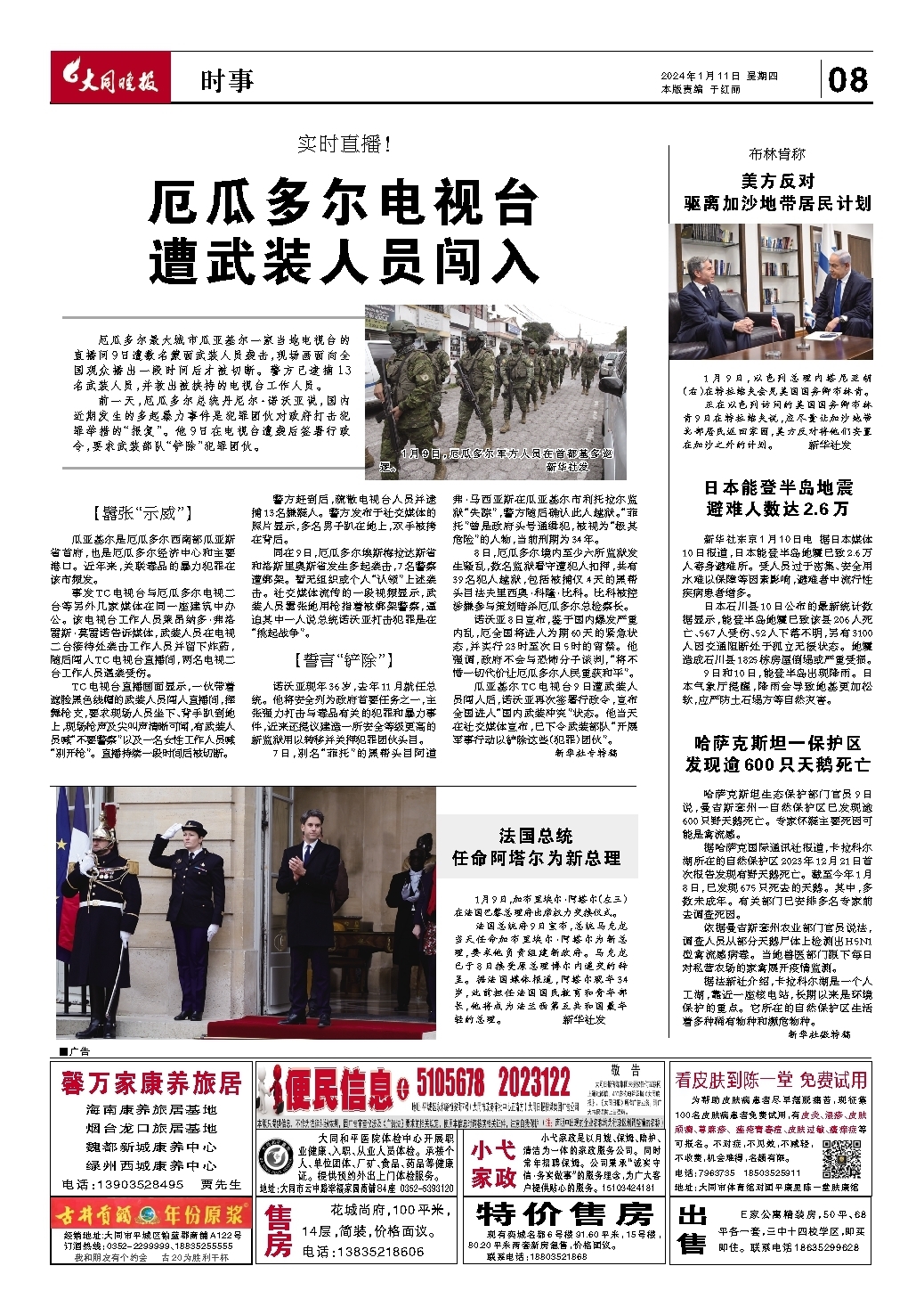 瓜亚基尔TC电视台9日遭武装人员闯入后,诺沃亚再次签署行政令,宣布全国进入“国内武装冲突”状态。他当天在社交媒体宣布,已下令武装部队“开展军事行动以铲除这些(犯罪)团伙”。
