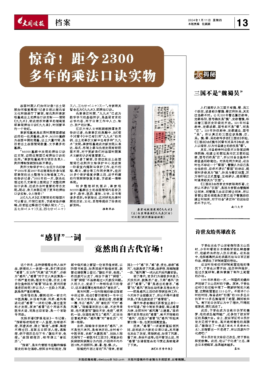 江汉大学人文学院副教授谭竞男告诉记者,先秦秦汉的典籍中,如《荀子》《管子》中已有引用“九九术”的用例,出土的秦汉文献中也有多种“九九术”发现。秦家咀墓地此次新发现从表达、格式、形制上都与先前发现有较明显不同,对于更新我们对战国时期算术文献的认识有重要意义。