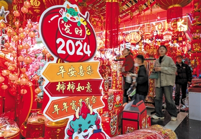 龙年春节临近,云南昆明新螺蛳湾国际商贸城内的节日饰品购销两旺,春联、灯笼、龙年挂饰、中国结等受到顾客青睐。 新华社发