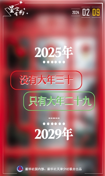 新华社天津1月13日电 近日一则“未来5年都没有大年三十”的消息引发公众关注。消息称,2024年2月9日是近年来最后一个大年三十,因为从2025年起至2029年都没有大年三十,只有大年二十九。天文科普专家表示,大年三十时有时无是正常历法现象,系农历大小月所致。