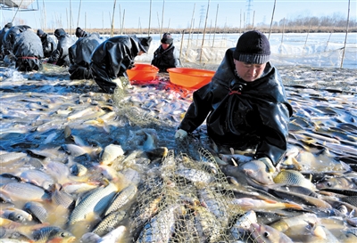 1月13日,河北省唐山市曹妃甸区第八农场的淡水鱼养殖户在鱼塘捕鱼。
