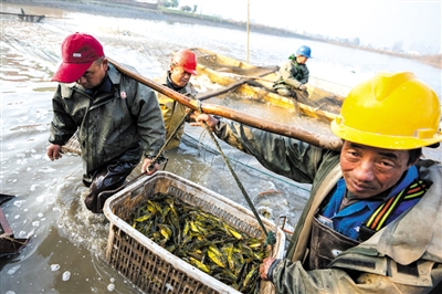 1月13日,渔民在湖南省益阳市武圣宫镇沿河堤村搬运捕捞的黄颡鱼。