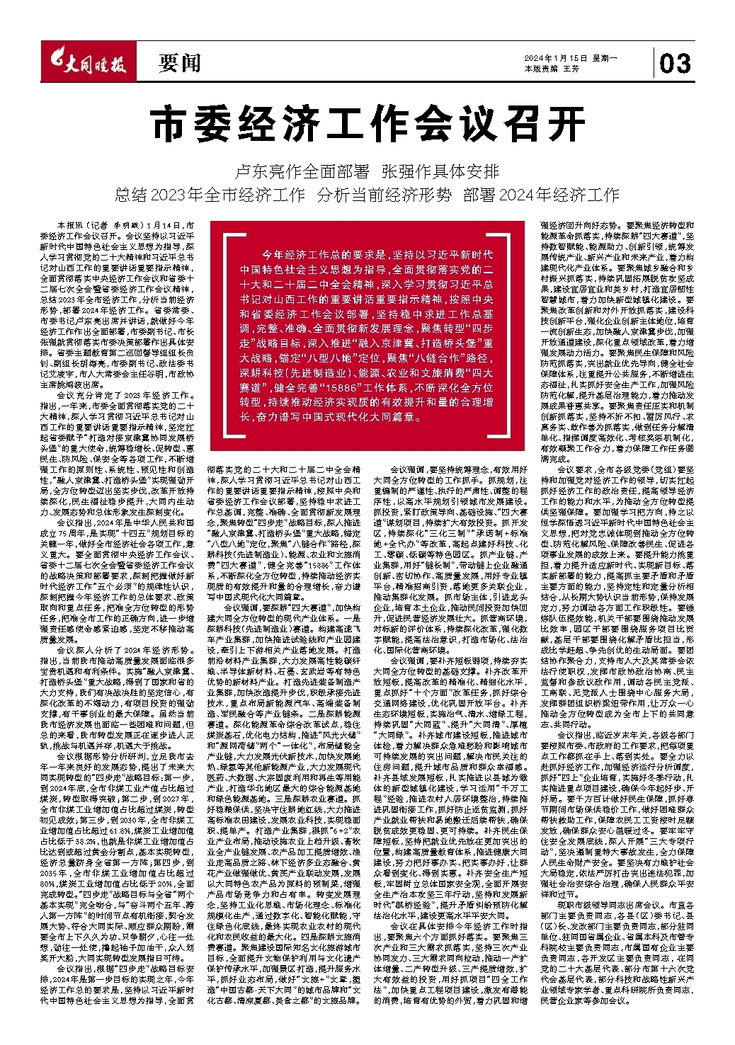 ~~~卢东亮作全面部署 张强作具体安排 总结2023年全市经济工作 分析当前经济形势 部署2024年经济工作