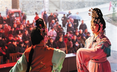 1月15日,演员在伊塘镇长木塘村表演祁剧《孟丽君》。