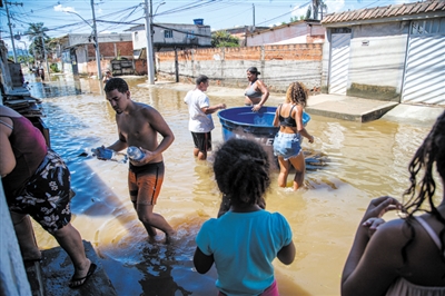 1月16日,在巴西里约州卡希亚斯公爵城,志愿者为受灾居民送饮用水。