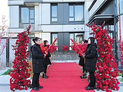 接到喜讯后,物业工作人员便开始积极配合布置小区内婚礼现场。红火的喜字、彩虹拱门、浪漫的气球、喜庆的红地毯等,每一个细节都是对新人的美好祝福。