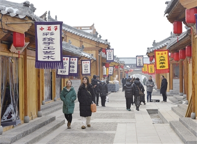 近年来,平城区马军营街道小石子村依托独特的自然、地理、文化等方面优势资源,围绕“吃住行游购娱”等要素,积极打造休闲娱乐、民宿餐饮、冰雪旅游等为一体的乡村旅游新业态,做活做火冬季旅游。图为游客在小石子村文旅小镇观光游览。 本报记者 戎禹仁 摄