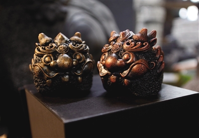 1月17日,记者走进火山石非遗文创工作室,火山石雕刻技艺非遗传承人刘坚正在和徒弟们忙着赶制龙年文创产品。修坯、抛光、打磨、高温着色……通过一些列复杂工序,一款头顶福字、身背元宝、复古典雅的“小龙宝”摆件诞生了。“‘小龙宝’又名福龙送宝,采用火山石和火山陶相结合的特殊工艺和中国传统布老虎的造型设计,目前有黄铜和红铜两种颜色。除了这款产品,我们还制作了小龙手把件,寓意龙年红红火火。”刘坚说。