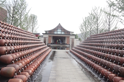 穿过迎楼门楼,绕过“沙洲优黄”照壁,“哗哗”的流水声入耳。抬眼望去,只见千泉广场前伫立了两个酒坛巨阵,其设计灵感来源于沙洲优黄存酒仓库。1724口酒坛,双侧9层错落堆叠,每个酒坛口就是一个小型瀑布,瀑布层层跌落,颇为壮观。1724口酒坛一齐倾倒甘醴,一时水声喧嚣,雾森缥缈。层叠瀑布,雾喷效果,尽显江南水乡秀美,也寓意沙洲优黄百年传承,源源不断,生生不息。