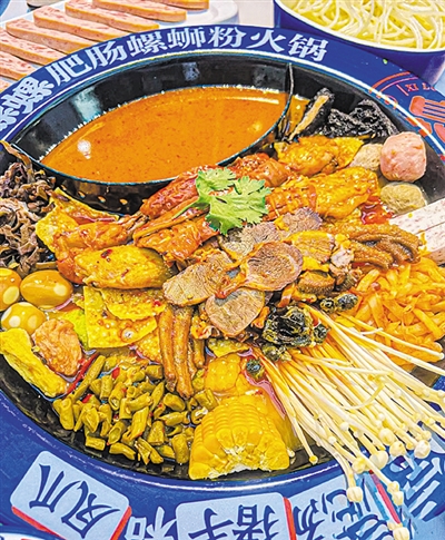 日前,记者来到这家名叫“喜螺螺”的肥肠螺蛳粉火锅店,刚走到饭店附近,就闻到了浓烈的螺蛳粉味道。当服务员把点好的锅底端上桌时,那浓郁的味道更是扑鼻而来。不过,肥肠螺蛳粉火锅真的会让喜欢吃的人越吃越上头。而且,吃肥肠螺蛳粉火锅还有讲究,要先吃吸满汤汁的肥肠、炸蛋和豆泡,接着嗦粉,然后再涮菜。