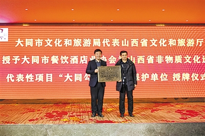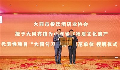 在当天的授牌仪式上,大同市文化和旅游局代表山西省文化和旅游厅授予大同市餐饮酒店业协会为大同勾刀削面保护单位,大同市餐饮酒店业协会授予大同宾馆为大同勾刀削面示范单位。