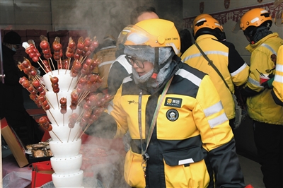 ▲1月23日,在北京市海淀区北太平庄街道户外劳动者暖心驿站,一名外卖员(前)准备品尝糖葫芦。
