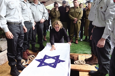 ◀ 1月23日,在以色列特拉维夫的一处公墓,家人送别一名以色列士兵。