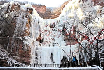 1月25日,游客在赞皇县嶂石岩景区观赏冰瀑。