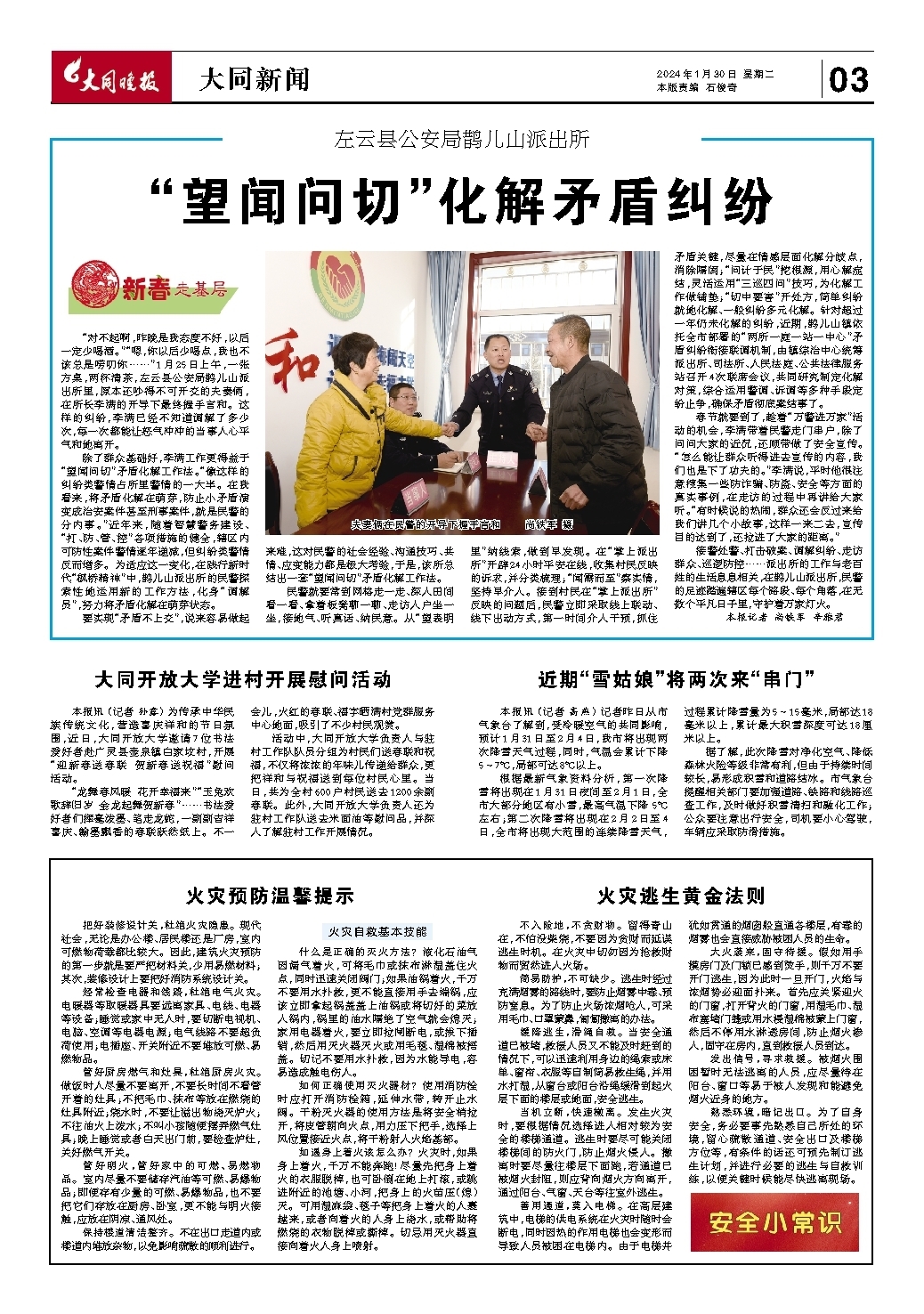 活动中,大同开放大学负责人与驻村工作队队员分组为村民们送春联和祝福,不仅将浓浓的年味儿传递给群众,更把祥和与祝福送到每位村民心里。当日,共为全村600户村民送去1200余副春联。此外,大同开放大学负责人还为驻村工作队送去米面油等慰问品,并深入了解驻村工作开展情况。