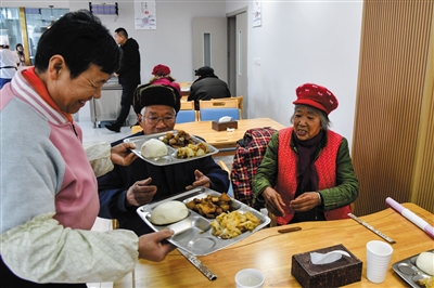 ◀1月29日,工作人员在济南市长清区马山镇综合养老服务中心餐厅为老人分送午餐。