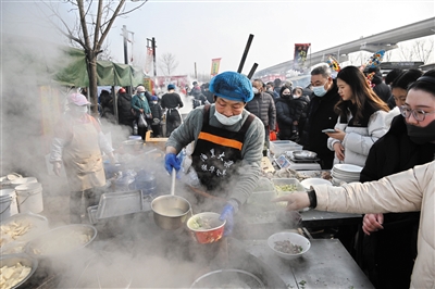▶1月29日,人们在泊里大集上选购风味小吃。