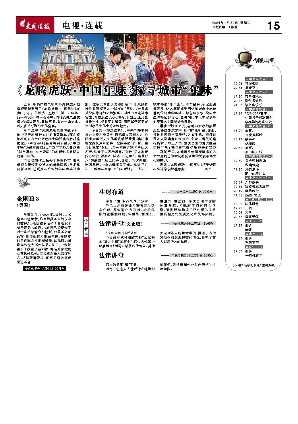 据悉,《龙腾虎跃·中国年味》将于近期在央视综合频道播出。 韩平