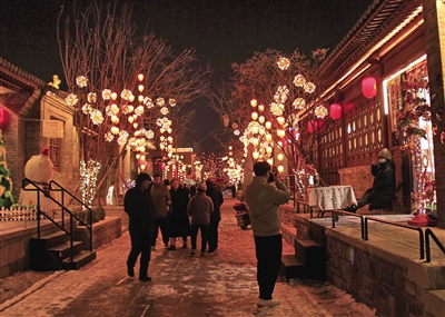 东南邑向西,与鼓楼东、西街相连,这是大同古城内最具特色的传统古街,大戏台、关帝庙、纯阳宫及各种民宿、美食、创意工坊都集中在街道两边,古色古香的建筑与喜庆吉祥的红灯笼组成一幅幅别开生面的春节图景。手拿一串糖葫芦漫步其中,内心的欢愉真实而丰沛。