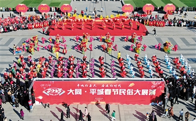 ● 2月13日和16日,在古城华严广场等地开展行进式表演,展示云胜锣鼓、剧情秧歌、伞舞、跑驴、旱船、担花灯、地秧歌等云冈区最具特色的民俗社火节目。
