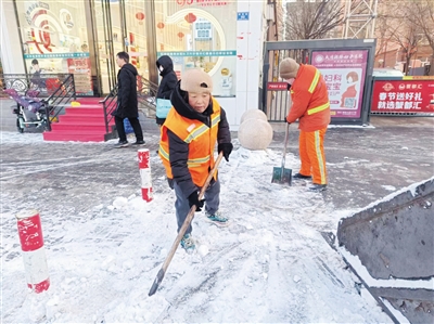 将凯旋城小区北门前的积雪清运完,记者与郭丽荣一起巡查责任区的清雪情况。走到一家饭店门前时,郭丽荣快跑几步,捡起非机动车道上的塑料袋和包装膜,她说:“对我们环卫工来说,马路就是流动的家。家净,心才安。”