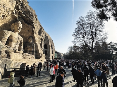 春节假期,我市各旅游景区游人如织,人们赏美景、品美食,乐享古都大同浓厚的文化气韵。图为16日,云冈石窟景区迎来众多中外游客。 本报记者 于宏 摄