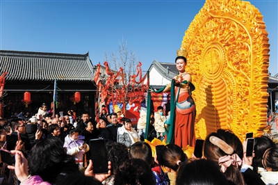 云州区的表演团队表演了挠阁、舞龙、踢鼓秧歌、跑旱船等精彩节目,挠阁作为闹红火的重头戏,被称为无言的戏剧、空中的舞蹈,表演者身着节日盛装,伴随节奏不停变换队形,挠阁上的孩童衣袂飘飘,随风起舞,红火热闹的表演让人目不暇接。