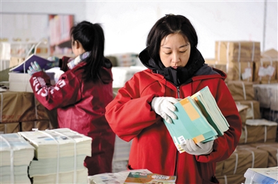2月21日,在成安县新华书店教材发行中心,工作人员在整理教材。