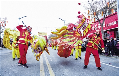 2月24日上午,由彩车、秧歌、舞龙舞狮等19支表演队伍组成的阳高县民俗社火巡游表演在县城主干道进行,表演者个个精神抖擞、意气风发,展现了阳高儿女朝气蓬勃、奋发向上的精神风貌。图为表演现场。