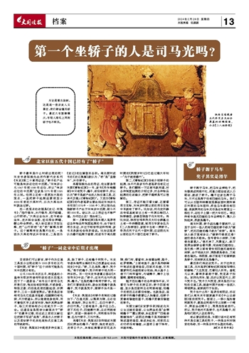公元1086年农历五月,刚登基的小皇帝宋哲宗和垂帘听政的老太后高太后下了一道恩旨:“尚书左仆射司马光所患已安,惟足疮有妨拜跪,不候参假,特放正谢,仍权免赴前后殿起居,许乘轿子,三日一至都堂聚议。”意思是说宰相司马光已经基本痊愈,但腿脚仍有毛病,不方便磕头,所以继续免参免拜,用不着每天早上进宫问安,准许其乘坐轿子,每三天到宰相办公的地方开一次会。这道圣旨是现存文献里关于“轿子”的最早记载,而在此之前的文献往往把轿子写成“肩舆”,那是古人对轿子以及类似轿子的其他肩抬式交通工具的传统称呼。
