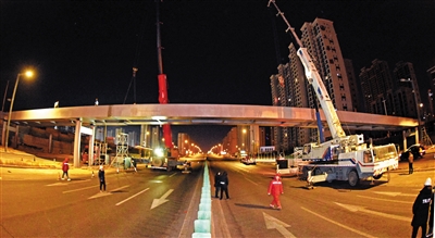 本报讯 (记者 辛雅君) 3日0时40分,随着最后一块26米长的钢桥箱梁稳稳地架在同煤快线和友谊南街交汇处的桥墩上,开源街智家堡公园人行过街天桥主跨钢结构吊装完成,预计5月投入使用。