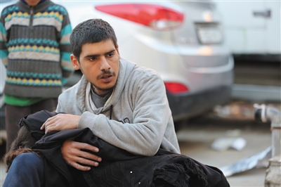 ▲3月8日,在加沙地带中部的阿克萨医院,一名男子怀抱遇难者遗体。