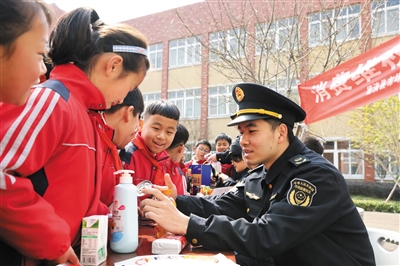 ▶3月13日,在浙江省湖州市德清县乾元镇中心小学,市场监管执法人员向学生们传授如何辨识消费品。