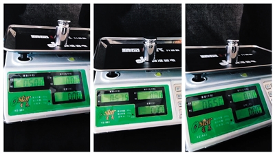 店主分别按下“M1、M2、M3、计数、电压、动态”等几个按键,同一桶洗洁精居然分别显示出“1175、1230、1285、1345、1400、1455”几个称重数值,最大增重335克。