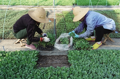 ▶ 3月13日,在宝鸡市陈仓区东关街道西高泉村一处种苗基地内,农民挑选用于销售的蔬菜种苗。