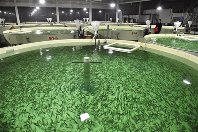◀ 3月13日,在山东省微山县的微山湖现代渔业产业园的鱼苗育种场,工作人员在培育鱼苗。